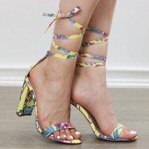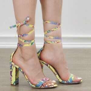 Floral High Heel Sandals Tie-Up Block Heel Open Toe Vibrant Print