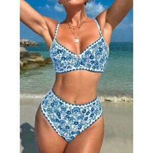 Floral High Waist Underwire Bikini Bathing Suit Blue