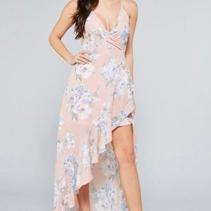 Floral Ruffle High-Low Maxi Dress, you’ll always be in love! Soft fabrication, in a lovely pink, white, blue and green floral print, dances across a surplice neckline with elegant princess seams. A set of crisscrossing adjustable straps top off the alluring lace-up back. A wrapped maxi skirt stuns with a flouncy ruffles before falling to a high-low hem. Hidden back zipper/clasp.