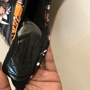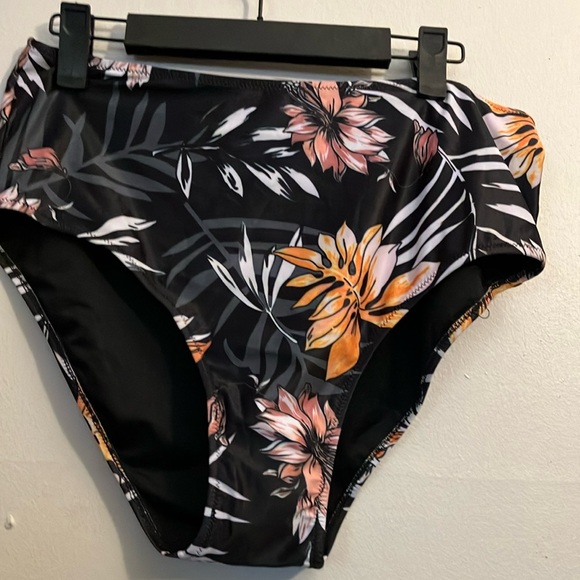 Stylish high-waisted bikini bottom with a vibrant floral design. Features a mix of black, orange, and pink hues for a chic beach look.
