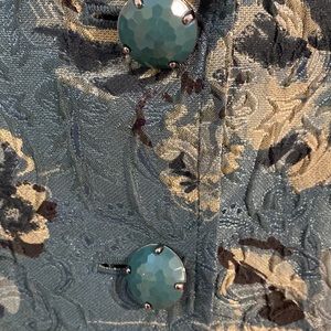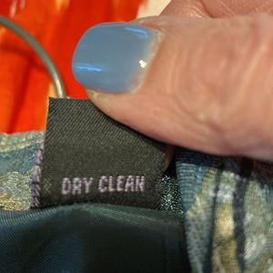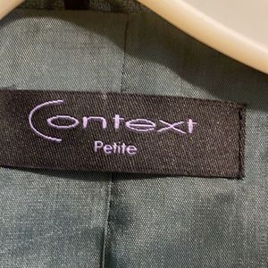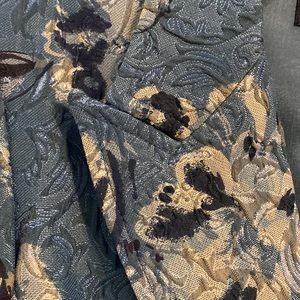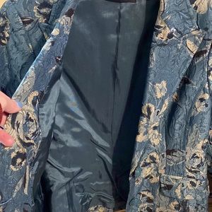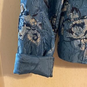 Beautiful cropped jacket. Floral design in tan and black on a green background.