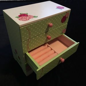 This is a four drawer jewelry box in amazing condition. Pictures above. This is a great gift idea for any little lady in your life! The measurements are about 4x8 inches