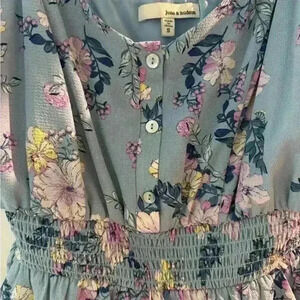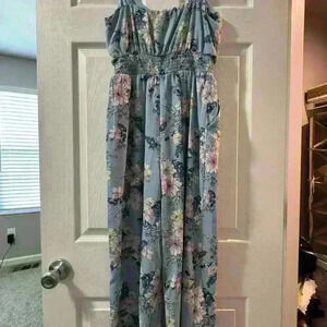 Adjustable straps and side pockets. Hits ankle length on me. Light dusty blue color. For reference I’m 5’3. Front buttons are also functional.