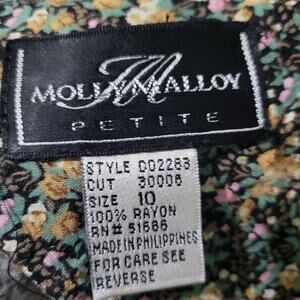 Vintage Molly Malloy Petites jumpsuit FEATURES a microprint floral pattern. Round neckline. Short puff sleeves. Button front closure with attached ties at the waist. Tapered pant legs. Soft rayon fabric.