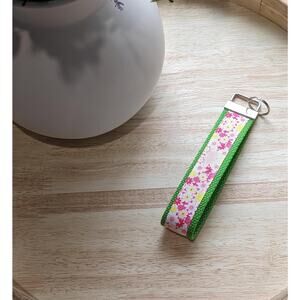 These wristlets feature a pretty floral (daisy like) design in pink and yellow. The green cotton webbing adds a nice pop of color. The hardware and keyring are silver in color.