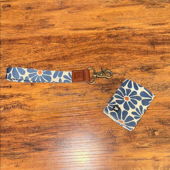 Stylish floral keychain and card holder set. Features blue and white flower pattern with brown accents.
