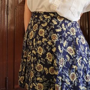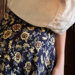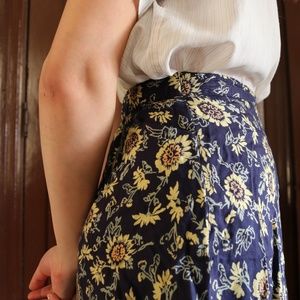 This is a floral navy blue mini skirt with a zipper on the side. It would look great with a plain blouse or t-shirt tucked in on a cool fall day. The colors are muted which give it a fall-esque feeling. The skirt is from the Kimchi Blue line from Urban Outfitters.