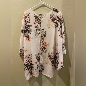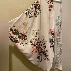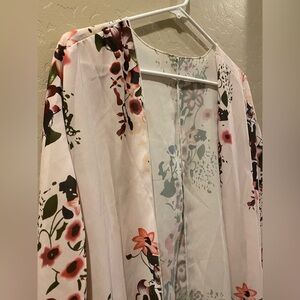 Elegant floral kimono cardigan with a flowy design. Features a mix of pink, green, and cream colors.