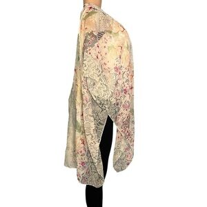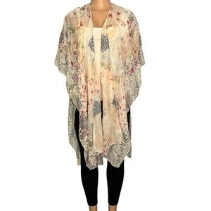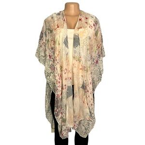 Elegant floral kimono. could be used as a swimsuit coverup as well.Perfect for adding a touch of style to your style... dress it up with a dress or wear with jeans or to the beach.. Great travel piece!