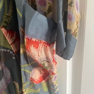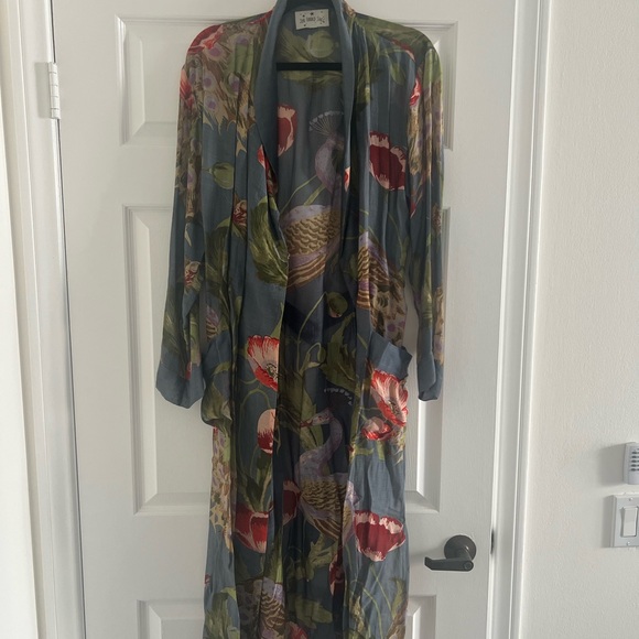Elegant floral kimono robe. Features vibrant patterns on grey background. Perfect for lounging or dress it up with heels and jeans and a tank top.