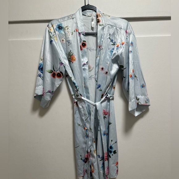 floral satin kimono robe with a tie belt. small faint stain (havent tried to remove) see last pic