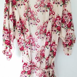 Elegant floral kimono robe with vibrant red and pink flowers. Perfect for a stylish and comfortable look. Originally purchased from Etsy to wear for wedding photos. 30 inches in length and one size. Has a tie inside and outside belt to tie for closure.