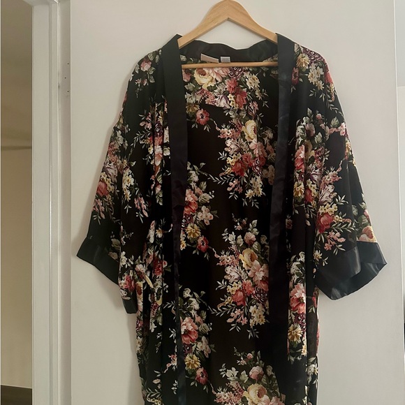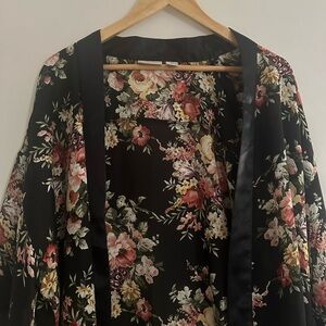 Elegant black kimono robe with vibrant floral patterns. Perfect for a stylish and comfortable look.