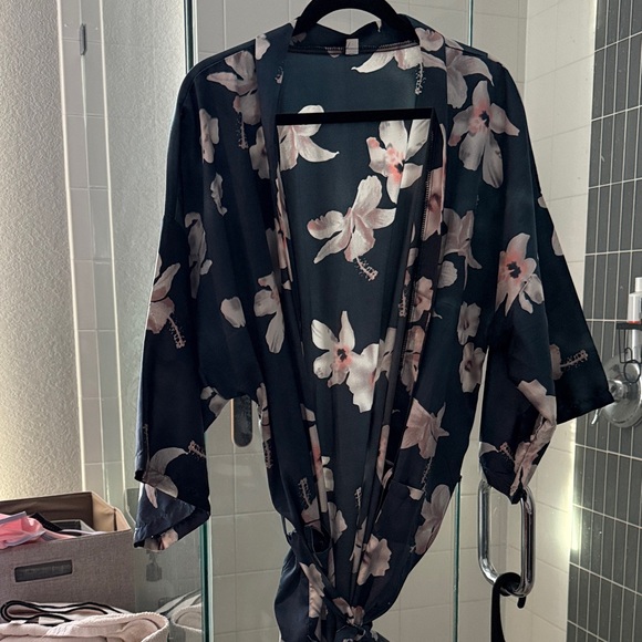 Elegant floral kimono robe with a dark base and light flower patterns. Perfect for lounging.