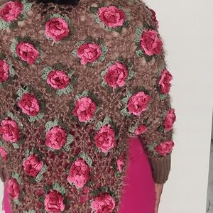 Cozy knit sweater poncho adorned with vibrant pink roses. Perfect for a stylish, warm look. preowned good condition fits L/xl