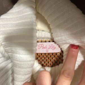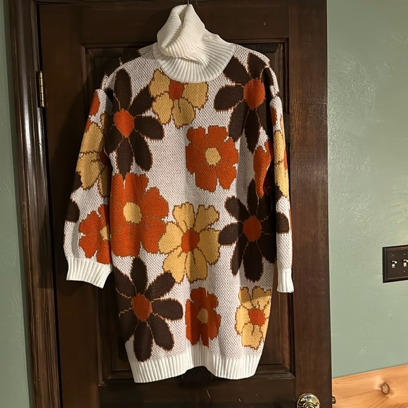 Stay cozy and stylish with this floral knit turtleneck sweater dress. Featuring a vibrant pattern in orange, brown, and cream, this dress is perfect for any casual outing.