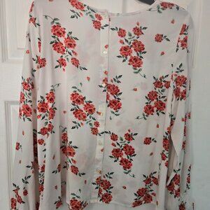 H&M Divided white long sleeve blouse top with reddish floral print, buttons down the back and elastic at cuff.