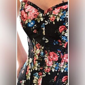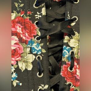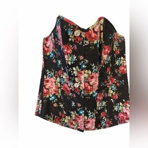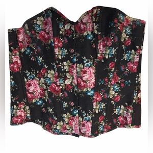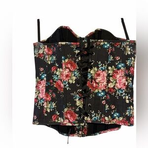Black Floral Print Back Ribbon Laceup Corset Bustier Top