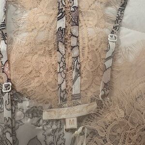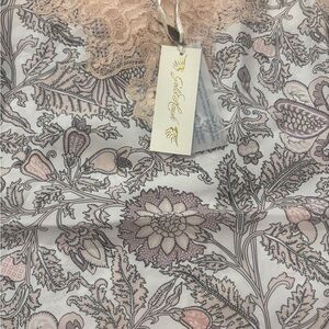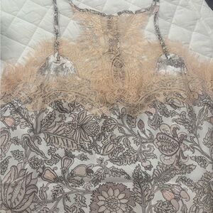 Chic camisole featuring a floral lace design. Accented with peach lace trim and a gray floral pattern for a stylish look.