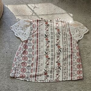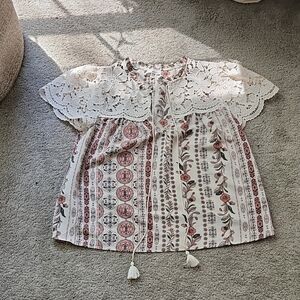 Charming kids top featuring a floral pattern and delicate lace details. Perfect for any occasion.