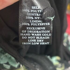 Lightweight semi-sheer fabric, delicate lace panel details, feminine tiered ruffle design, statement bell sleeves, flirty front cutout with tie closure, V-neckline, floor-length silhouette, black floral print, true-to-size fit