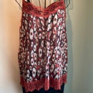 Elegant floral blouse with delicate lace trim. Features a stylish red and black pattern, perfect for any occasion.