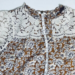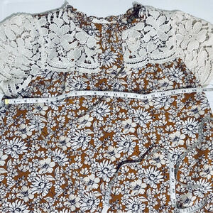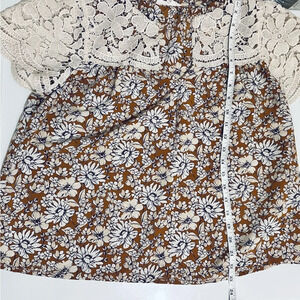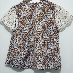 Elevate your style with this charming v-neck brown, beige, cream and white floral top featuring delicate lace trim and butterfly sleeves. Perfect for any occasion. Lightweight.