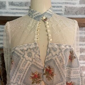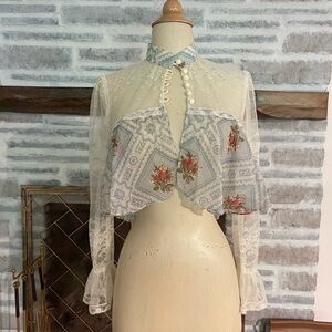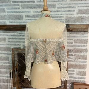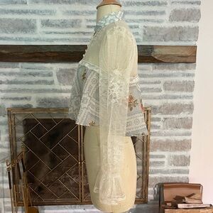 Elegant floral lace top with a delicate design. Features a beautiful cream and blue pattern, perfect for any occasion. Cream and blue lace jacket top with floral print, pearl buttons, and bell sleeves with no brand. #cottagecore #fairycore #victorian #vintage
