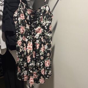Chic floral lace-up dress with pink and green accents. Perfect for any occasion.