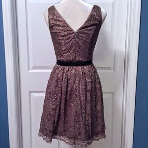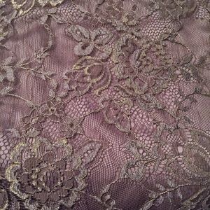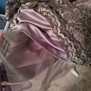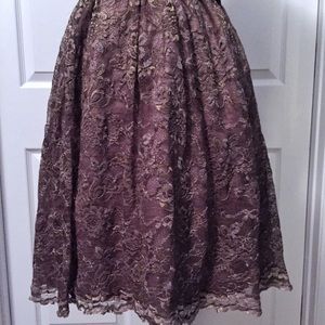 Beautiful lavender dress with gold flower overlay - attached slip with several layers of tulle to give the skirt some body. Stretchy black belt. Zips up back. Difficult to get a good pic of the color - depending on the light, it looks more lavender or gold.