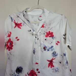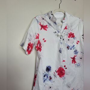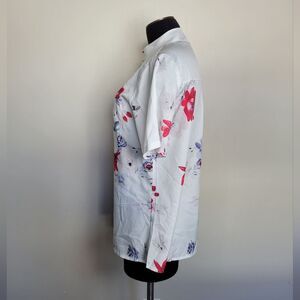 Beautiful lightweight blouse with a Japanese inspired floral print. White with pink colorway. Flattering notched neckline and slightly flared bodice fit. Lightweight thin material. Tagged size medium measures approximately 26 inches long 20 inches underarm to underarm laid flat.