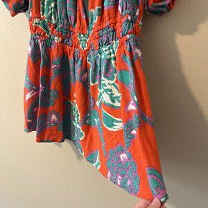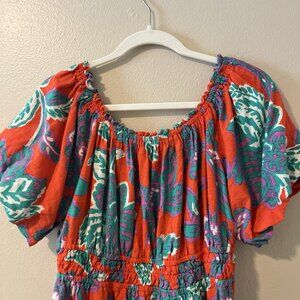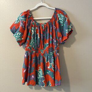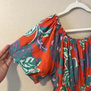 Floral Linen Top Off Shoulder Resort Vacation Boho Bright Bubble Sleeve 16