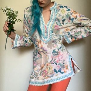 Beautiful linen tunic with floral and paisley print. Flowy and so colorful. Lovely little classy vibrant top. Perfect for dressing up for spring