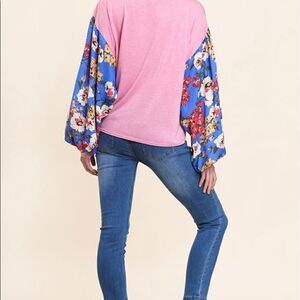 Floral Long Puff Sleeve Knit V-Neck Criss Cross Front Top-Pink