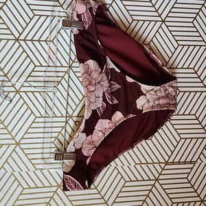 Stylish long sleeve swim set with floral design. The hygiene liner is attached, tried on only. The top has been worn once. The colors are burgundy,cream, and pale pink.