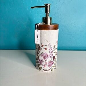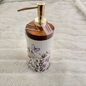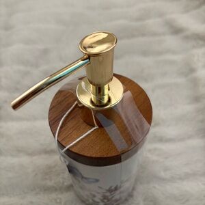 Elegant lotion dispenser with a floral design. Features a gold pump for easy use. Perfect for adding a touch of nature to your bathroom decor.