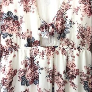 A beautiful white maxi dress with floral designs. Sheer sleeve and bottom, but has a white underlay so the rest is not sheer. A bow and cut out in the front, elastic waist.