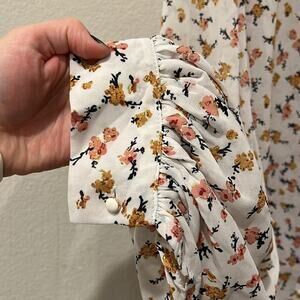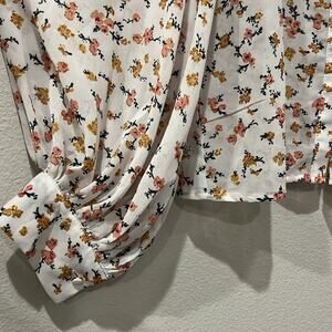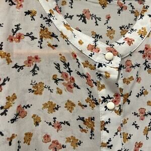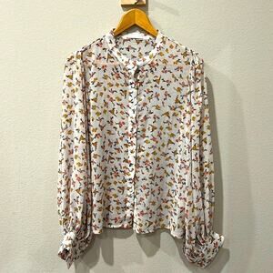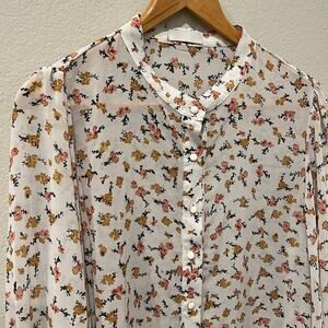Q2 brand sheer floral blouse. Soft white with pink and orange florals with metallic threading. Balloon sleeves, pearlized buttons. No major flaws, in great condition, gently worn.