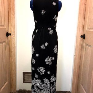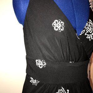 A classic and comfortable maxi dress. Chic black maxi with floral print. Style with sandals and a denim jacket for a casual look, or dress it up with a heel and pop of color.