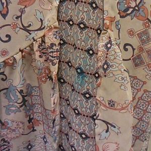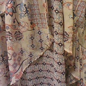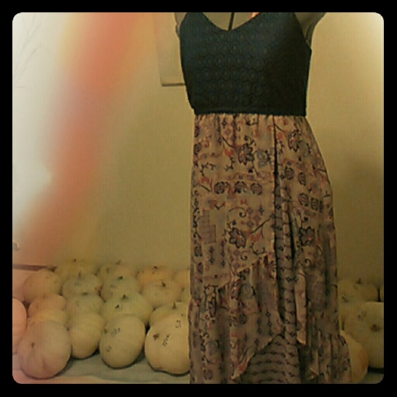 Elegant floral maxi dress featuring a blue bodice and pink patterned skirt. Perfect for any occasion.