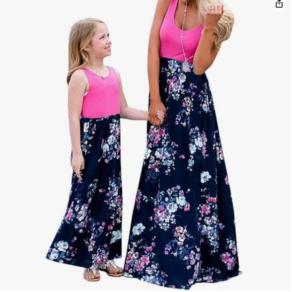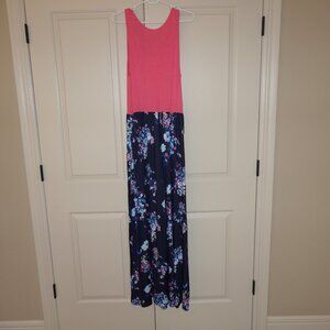 Elegant floral maxi dress featuring a vibrant pink top and a navy floral skirt. Perfect for any occasion, offering both style and comfort.