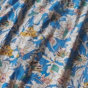 Elegant floral maxi dress featuring blue and white hues with orange accents. Perfect for any occasion.