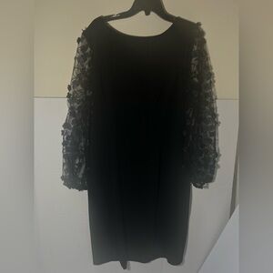 This elegant black dress features stunning sheer floral sleeves, perfect for any special occasion. Its classic design offers a sophisticated look.