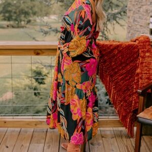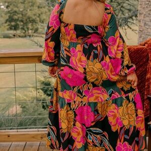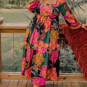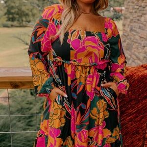 This cute, colorful abstract floral print dress has a scoop neckline and can be worn on or off the shoulders. It features long loose sleeves with elastic cuffs, a smocked upper back, hidden side pockets, and a flowy yet flattering silhouette that ends in a straight midi length hemline. Size 3XL.. All items listed are cross-posted, so if you see it one day & gone the next, it sold elsewhere!