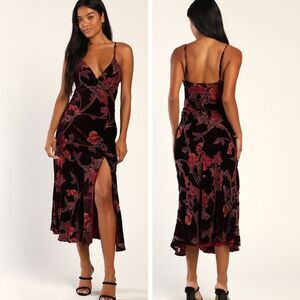Elegant floral midi dress featuring a stunning black and purple design. Perfect for any occasion.