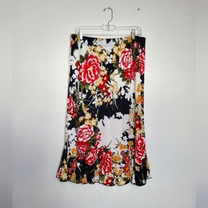 Stunning floral Midi length skirt with a bright bold and beautiful print. The white dots are raised and textured for an interesting and unique detail. A Ruffle on the bottom hem is a feminine touch. Elastic pull on waist. Excellent condition. Size large measures approximately 30 inches long 32 inches underarm to underarm laid flat.