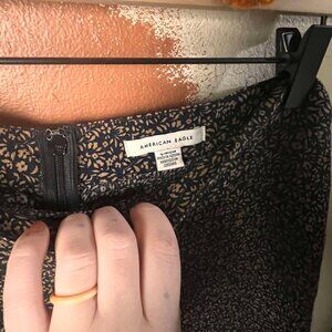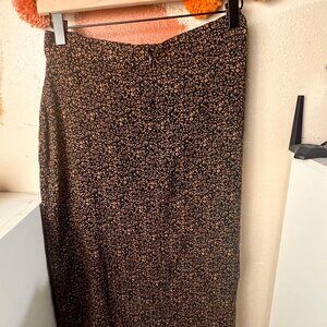 EUC and super cute midi skirt. It's black with a brown floral pattern on it, and a fun slit on the side. It's a lightweight material so it's great for summer, but can also be layered and paired with tights and boots. I'm sad to be getting rid of it, but it doesn't fit anymore. I wore it all the time, but it still has plenty of life left. Has a zipper in the back, and not stretchy material.