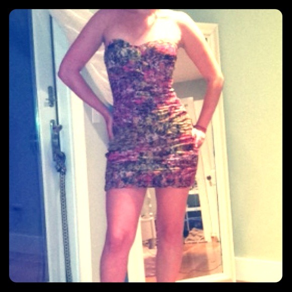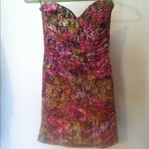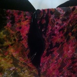 Floral pattern. Very right and It pretty short, too! The zipper is stuck about 2" from the the top, I've used a large safety pin to hold it together, there is also a clasp at the top to help with that.