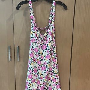 June is a slinky floral printed mini dress featuring a shirred bust, stretch waistband with cutout detail and gathered detailing on the criss-crossed straps at back. Partially lined.