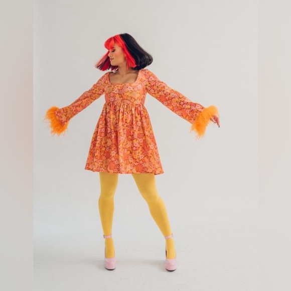 Make a statement with this floral mini dress, featuring vibrant orange feather cuffs. Perfect for any occasion.